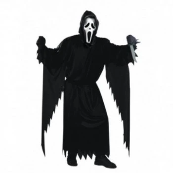 Scream-Kostüm für Erwachsene, Einheitsgröße, enthält eine lange, schwarze Tunika mit Kapuze und eine Maske.